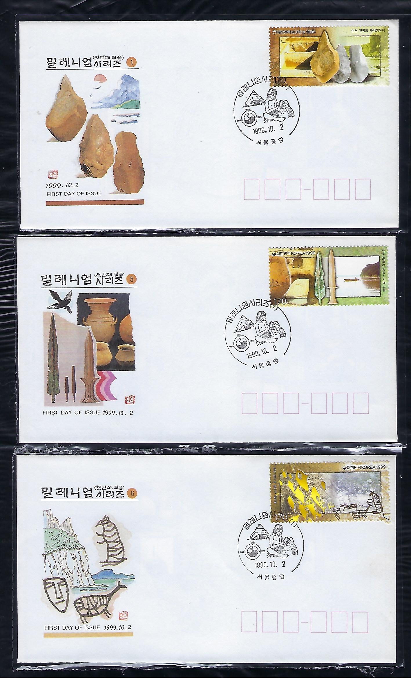 1999년 밀레니엄 시리즈 (제1집) 우표 안내 카드 포함 초일 봉투(FDC) 6완