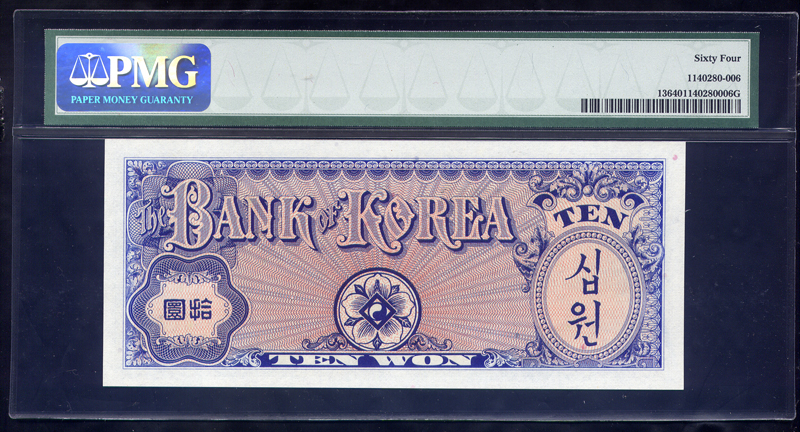 > 전체카테고리 > 우리나라 지폐 > 한국은행권 한국은행 10환권 (거북선)원권으로 상태는 사진에서 보시는 봐와 같이 더 설명이 필요 없는 최상위 미사용품 PMG 64 등급입니다.