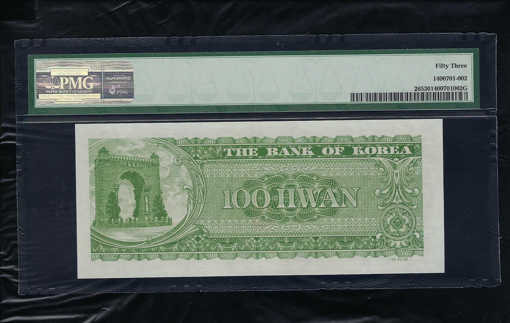 한국은행 개 갑 100 환권 모자상 1번 PMG 53