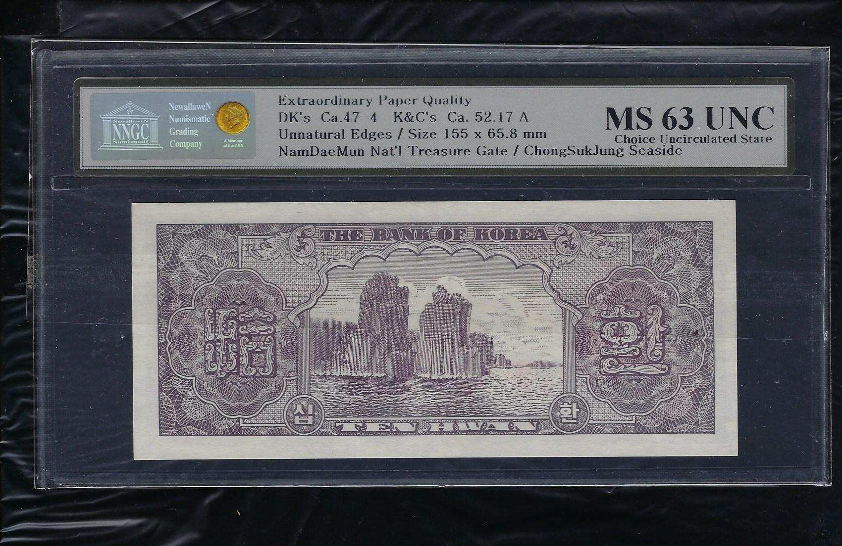 > 전체카테고리 > 우리나라 지폐 > 한국은행권 한국은행 신 10환권 4291년 백색지로 상태는 사진에서 보시는 봐와 같이 더 설명이 필요 없는 상위 미사용품 NNGC MS 63 UNC 등급입니다.