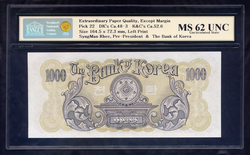 한국은행 신 1000 환권 4291년 NNGC MS 62 UNC
