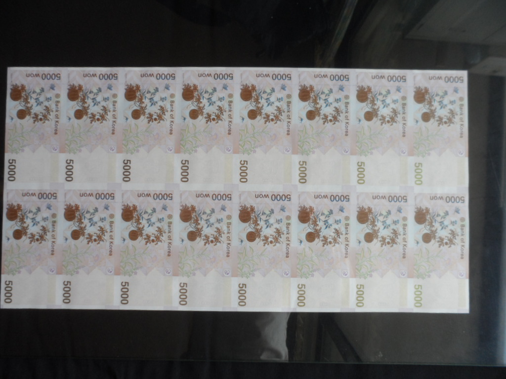 > 전체카테고리 > 우리나라 지폐 > 연결은행권 한국은행 마 5,000원 연결형은행권 16면부(AAA)로 전지형 은행권 입니다.