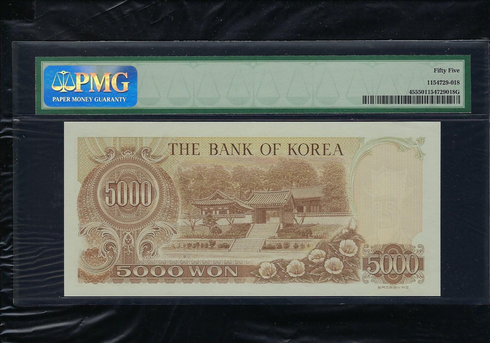 > 전체카테고리 > 우리나라 지폐 > 한국은행현행권 한국은행 2차 나 5000 원권으로 상태는 사진에서 보시는 봐와 같이 더 설명이 필요 없는 상위 준미사용품 PMG 55 등급입니다.