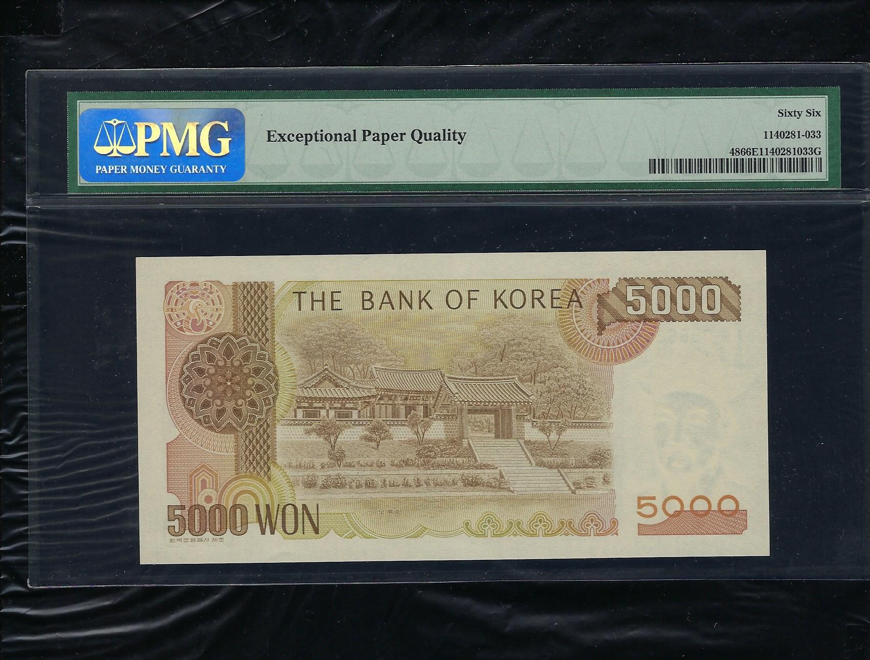 참고로 한국화폐도록 평가금액은 미사용품이 60,000원입니다만 상위 완미 PMG 66 등급은 훨씬 더 높은 가격에 거래됩니다.