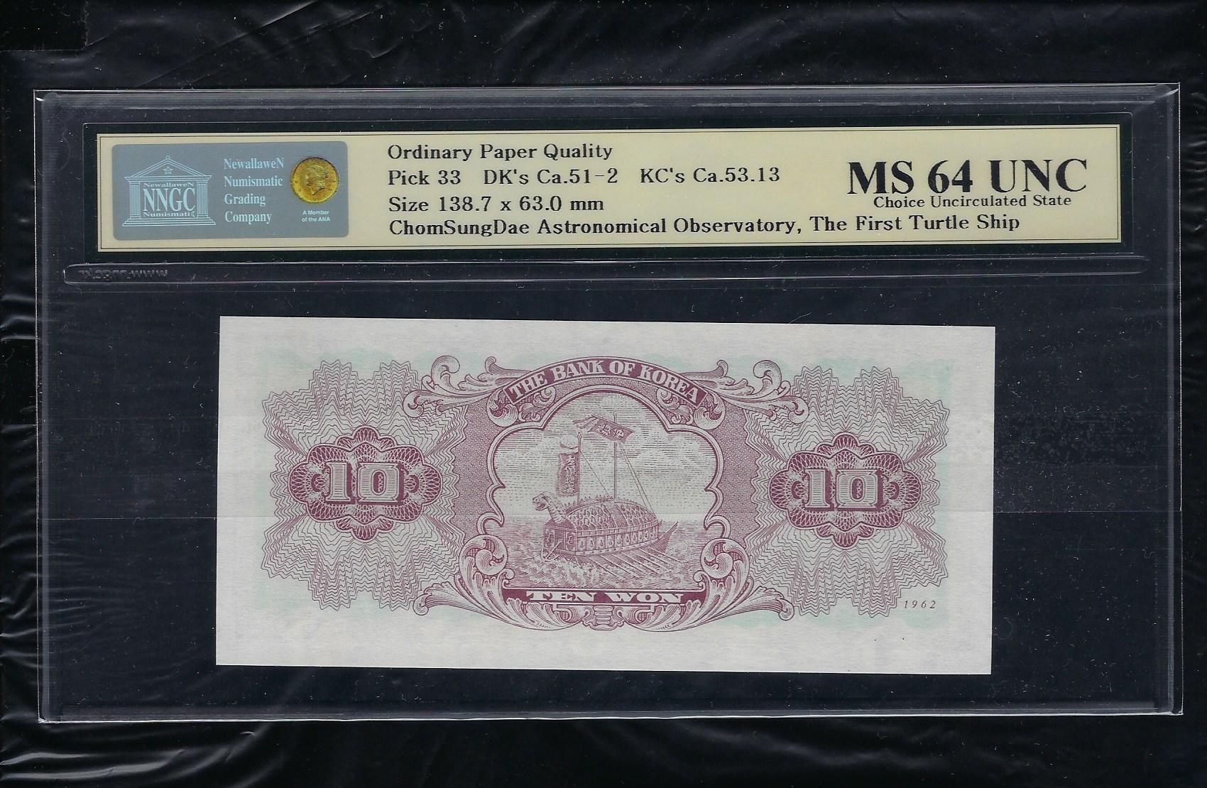 한국은행 나 10 원권 1962년 3번 NNGC MS 64 UNC