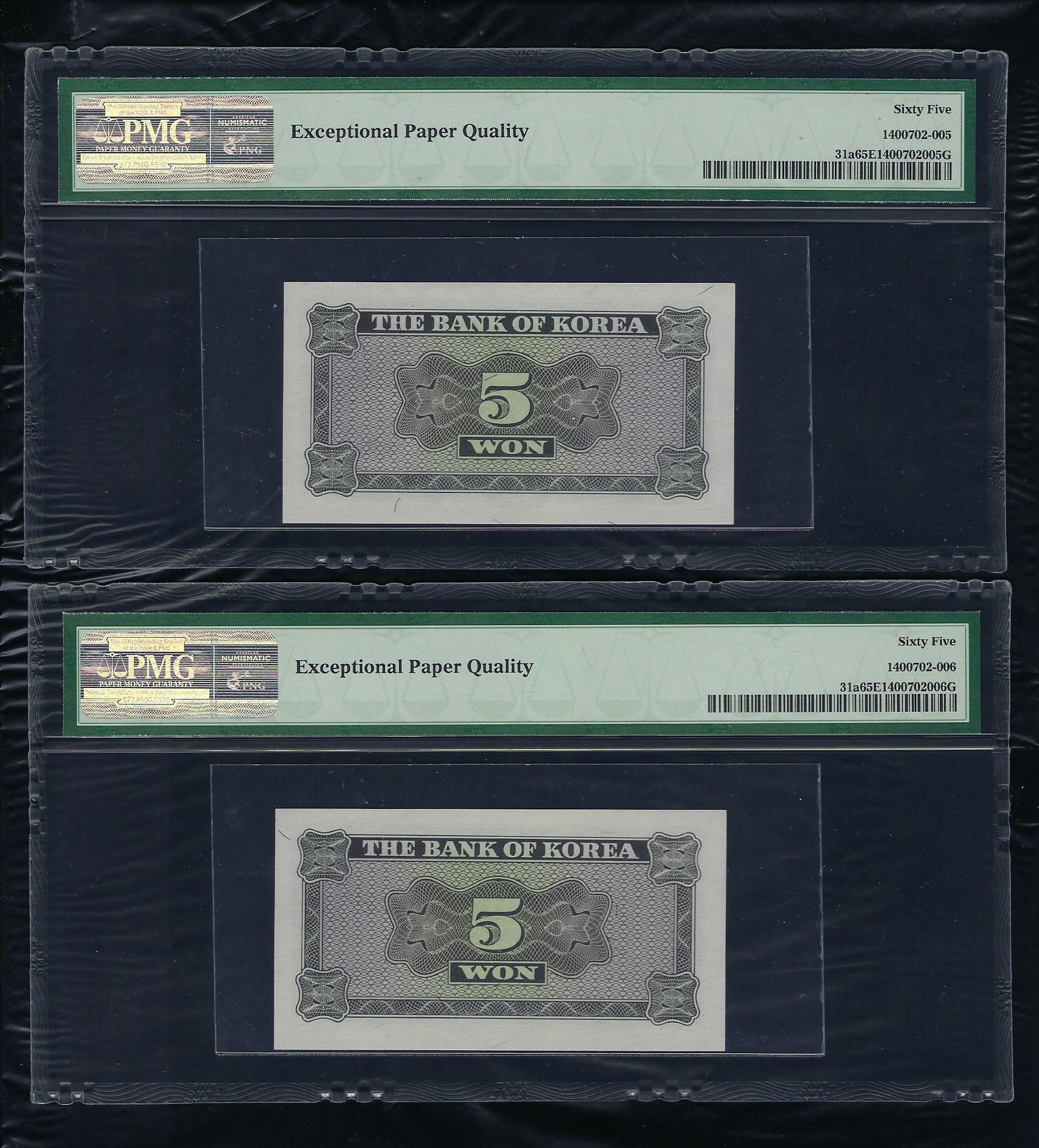 > 전체카테고리 > 우리나라 지폐 > 한국은행현행권 한국은행 5 원권 BK 기호 영제로 상태는 사진에서 보시는 봐와 같이 더 설명이 필요 없는 완전미사용품 PMG 65 EPQ등급입니다.