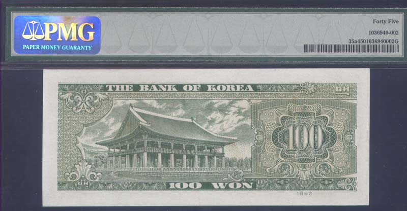 PMG 40-45 등급이 극미품입니다만 지폐만 보면 준미입니다. 상태가 사진과 같이 좋은데도 등급이 낮게 나왔습니다.주위 분 들은 뜯어서 누드로 준미사용품으로 올리라고하지만 그대로 올립니다. 참고로 한국화폐도록 평가금액은 극미품이 750,000원입니다만 최 상위 극미품 PMG 45 등급은 훨씬 더 높은 가격에 거래됩니다.