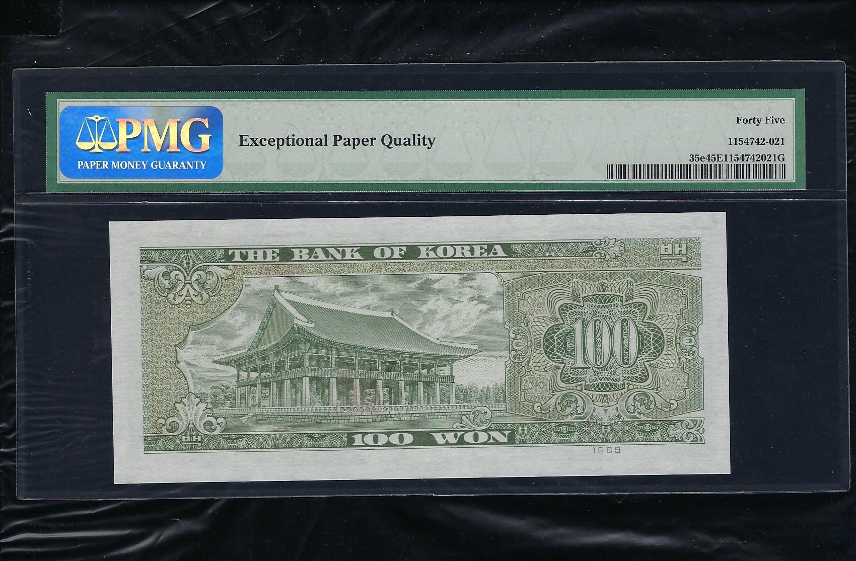 > 전체카테고리 > 우리나라 지폐 > 한국은행현행권 > 나100원권(경회루) 한국은행 나100 원권 경회루 1969년으로 상태는 사진에서 보시는 봐와 같이 더 설명이 필요없는 최 상위 극미품 PMG 45 등급입니다.