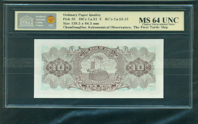 한국은행 나 10 원권 1965년 제 73 판 NNGC MS 64 UNC