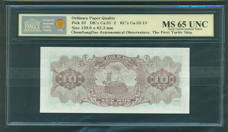 한국은행 나 10 원권 1963 년 제 30 판 NNGC MS 65 UNC