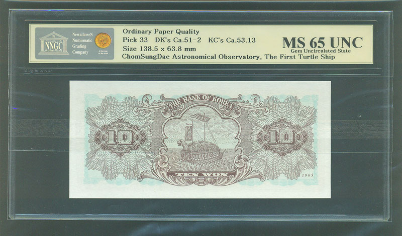 한국은행 나 10 원권 1965년 제94 판 NNGC MS 65 UNC