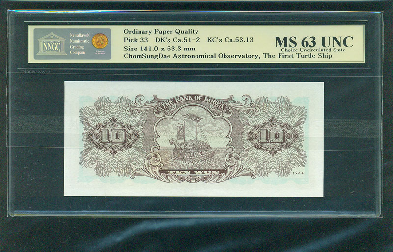 한국은행 나 10 원권 1964년 제 51 판 NNGC MS 63 UNC