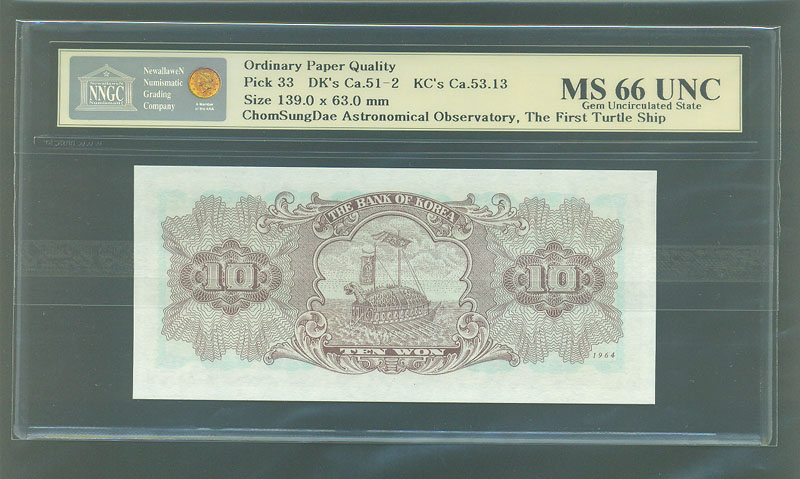 한국은행 나 10 원권 1964 년 제 38 판 NNGC MS 66 UNC