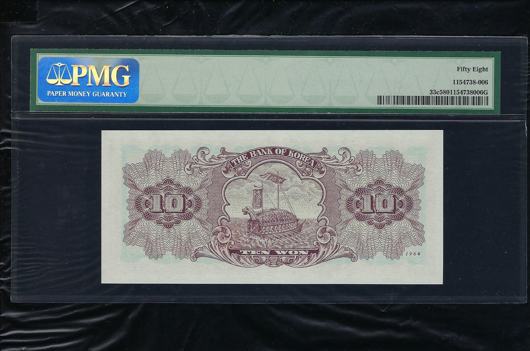한국은행 나 10 원권 1964년 제36판으로 상태는 사진에서 보시는 봐와 같이 더 설명이 필요없는 최 상위 준미사용품 PMG 58 등급입니다.
