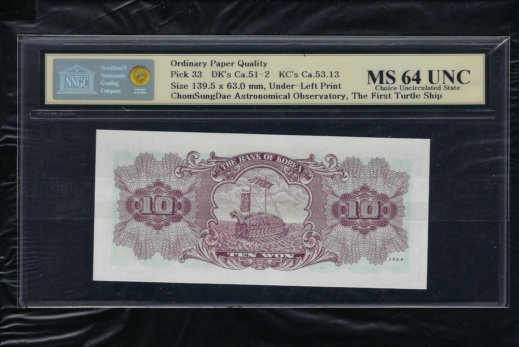 한국은행 나 10원권 1964년 44판으로 상태는 사진에서 보시는 봐와 같이 더 설명이 필요 없는 최 상위 미사용품 NNGC MS 64 등급입니다.