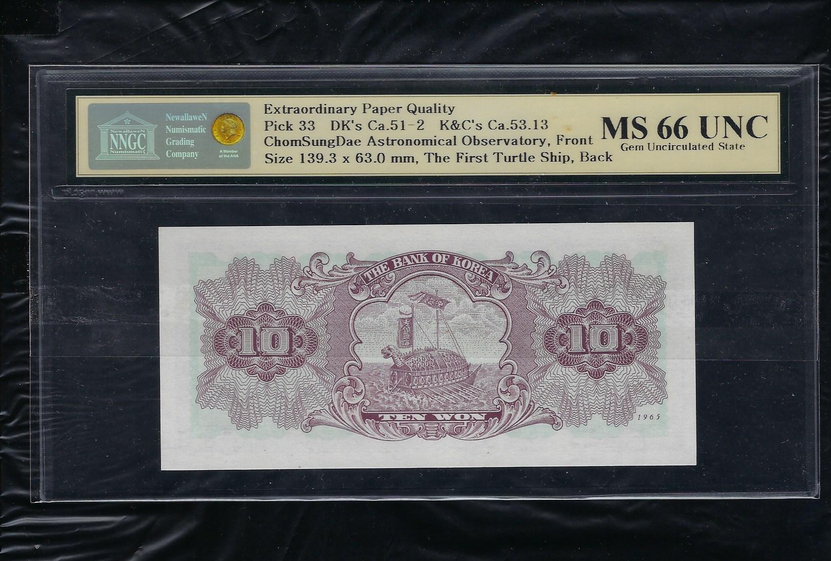 한국은행 나 10 원권 1965년 75판으로 상태는 사진에서 보시는 봐와 같이 더 설명이 필요없는 상위 완전미사용품 NNGC MS 66 UNC등급입니다.