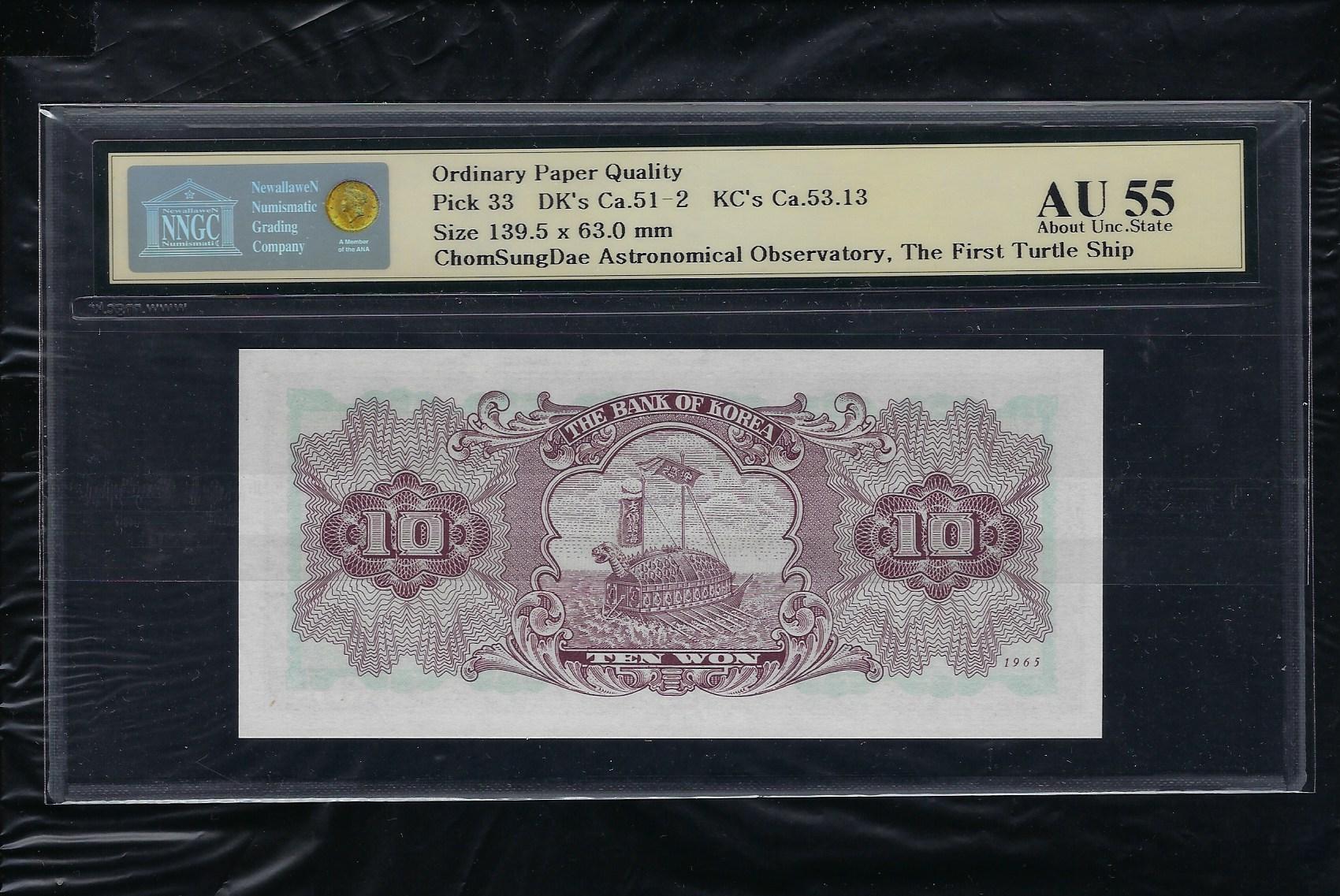 한국은행 나 10 원권 1965년 75판으로 상태는 사진에서 보시는 봐와 같이 더 설명이 필요없는 상위 준전미사용품 NNGC AU 55 등급입니다.