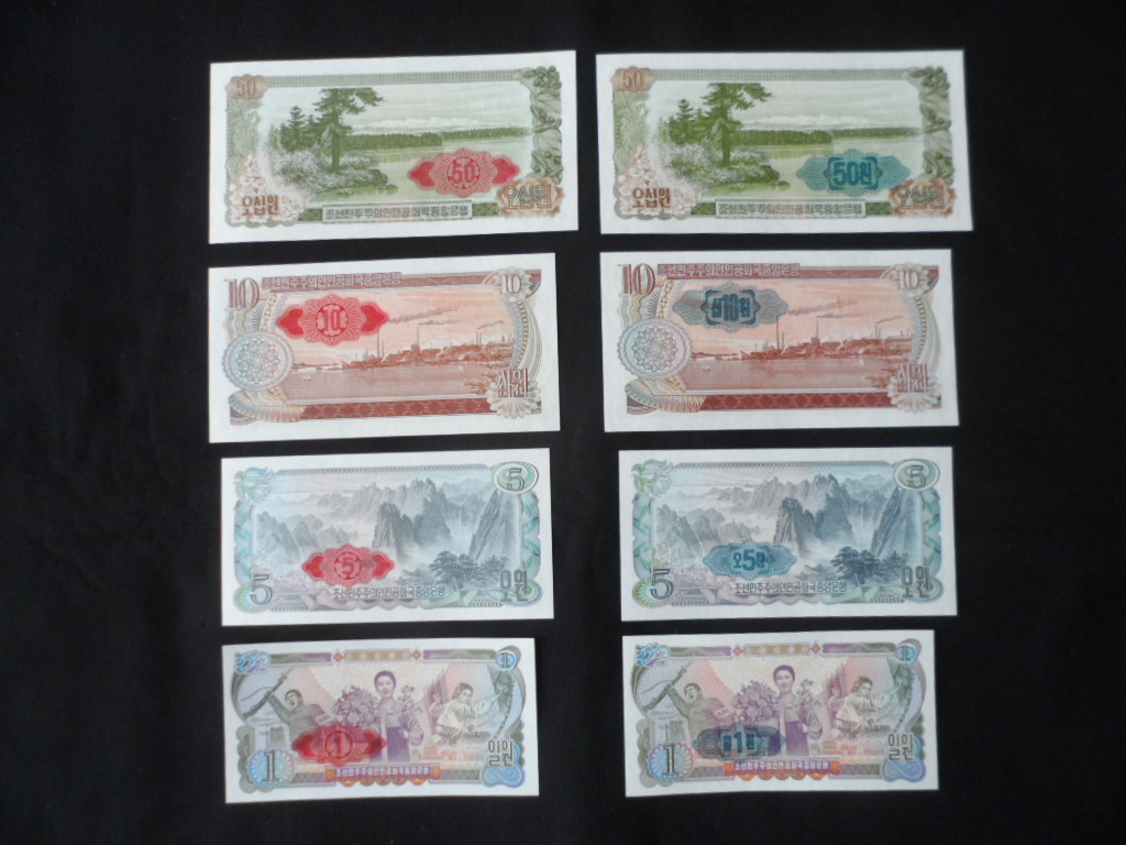 북한지폐 외화와 바꾼돈 50.10.5.1원 적색 청색 16종set 미사용품