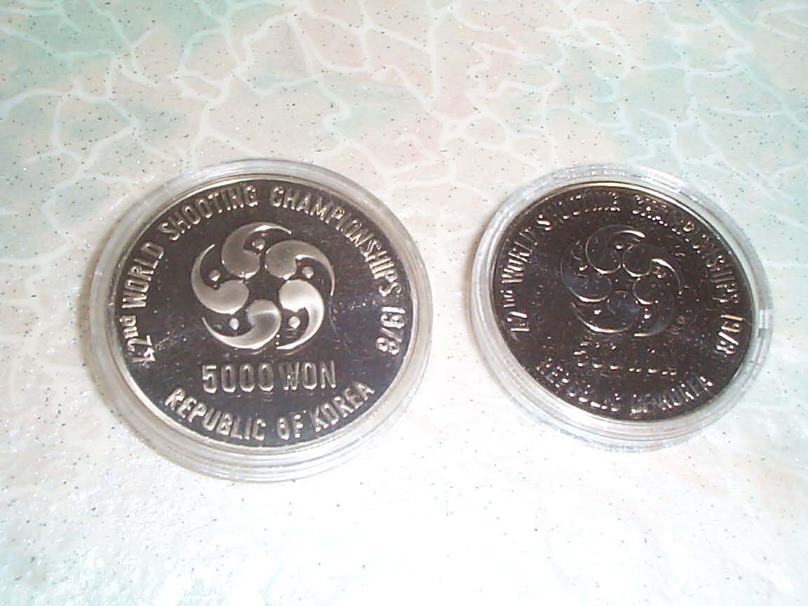 > 전체카테고리 > 주화 제42회 사격 선수권 대회 무광+유광 프루프화 2종set로 무광 5,000원화(은 95% 구리5%, 무게 23g 지름 35mm) 유광