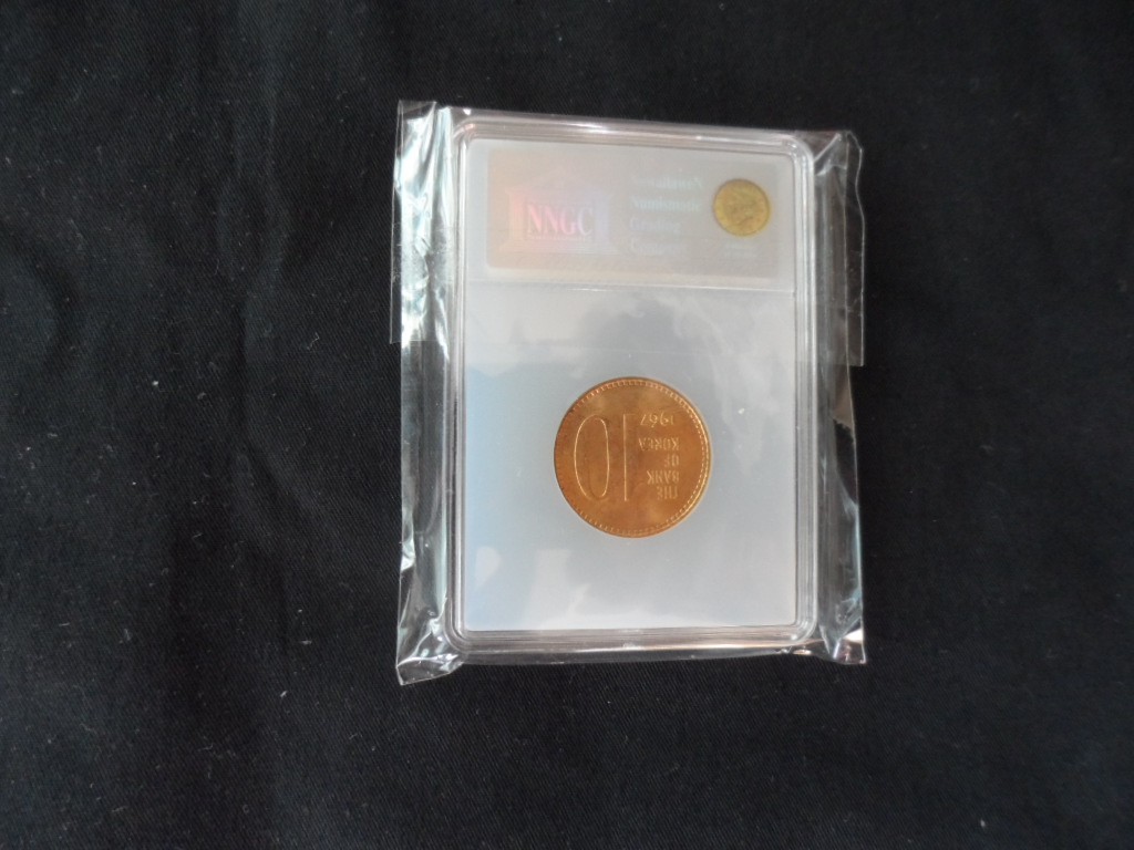 > 전체카테고리 > 주화 > 현행주화 > 현행주화 1967년 한국은행 발행 10원 주화 MS 63 UNC 등급으로 상태 미사용품입니다. 아주 귀한 연도입니다.