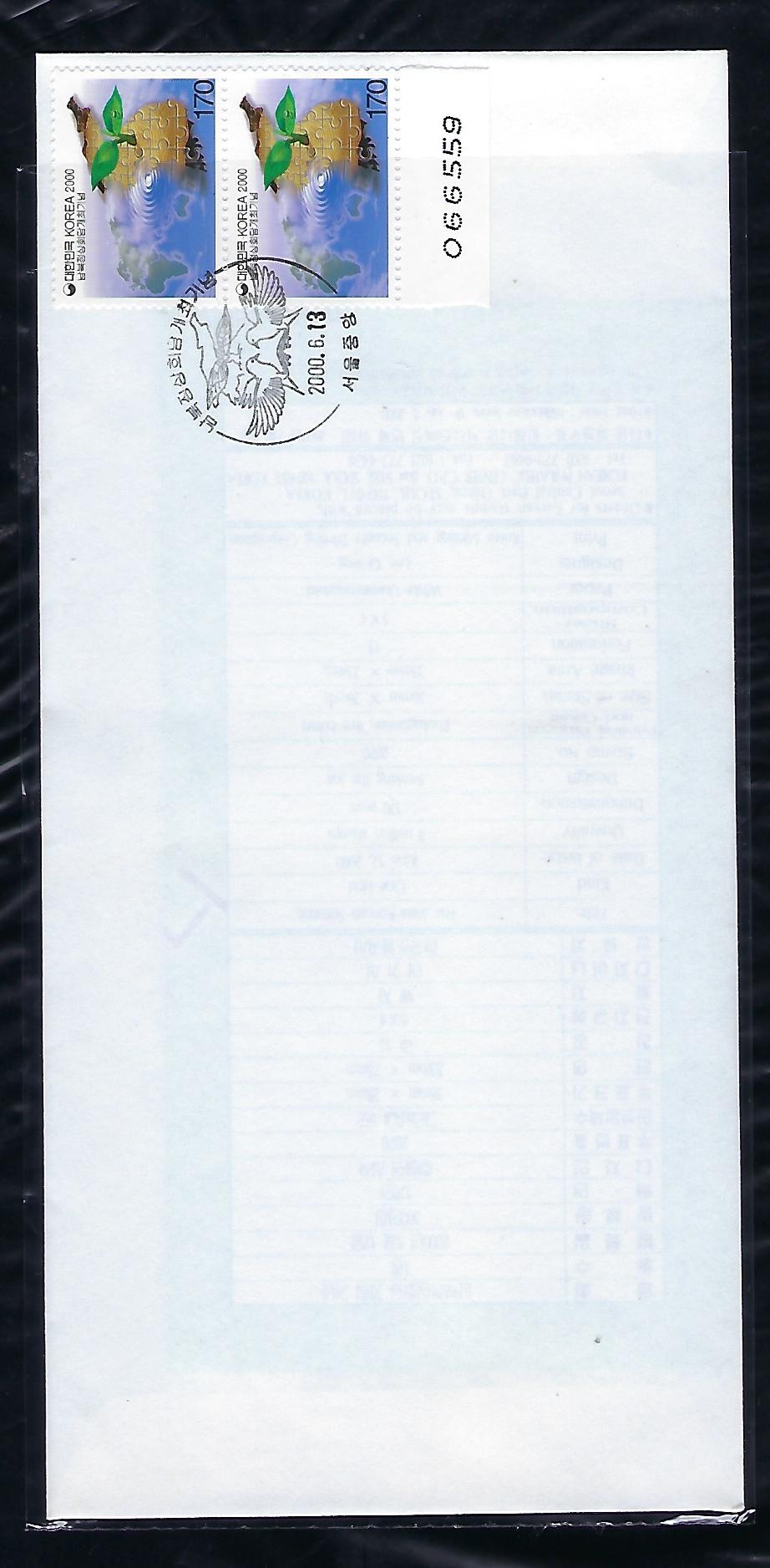 2000년 남북 정상 회담 개최 기념 우표 2장 안내 카드 포함 초일 봉투(FDC)