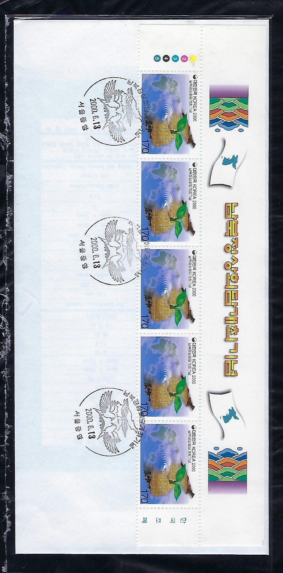 2000년 남북 정상 회담 개최 기념 우표 5장 안내 카드 포함 초일 봉투(FDC)