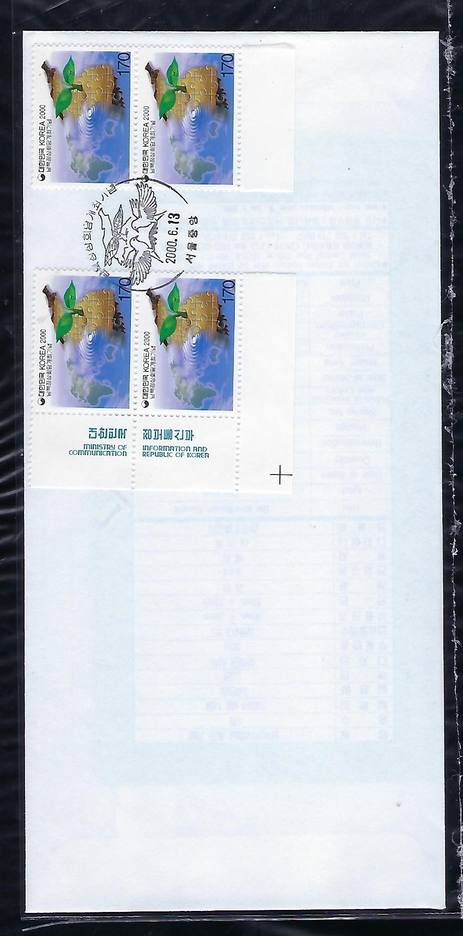 2000년 남북 정상 회담 개최 기념 우표 4장 안내 카드 포함 초일 봉투(FDC)