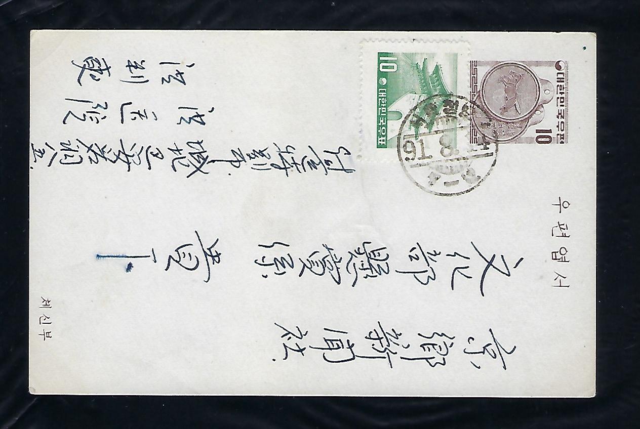10환 을지문덕 엽서에 10환 남대문 우표 첨부 실체