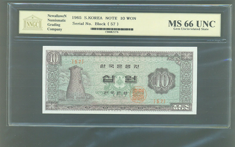 한국은행 나 10 원권 1965 년 제 57 판 NNGC MS 66 UNC
