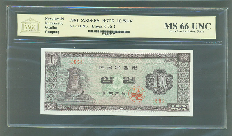 한국은행 나 10 원권 1964 년 제 55 판 NNGC MS 66 UNC