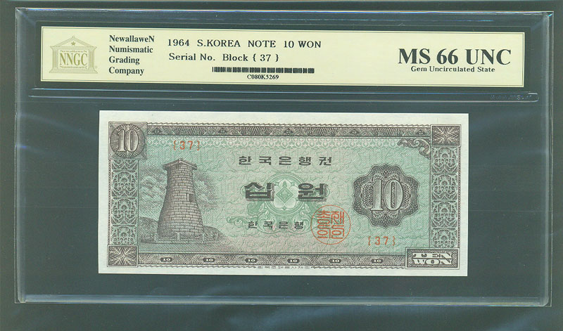 한국은행 나 10 원권 1964 년 제 37 판 NNGC MS 66 UNC