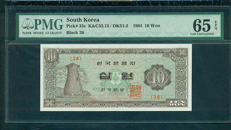 한국은행 나 10 원권1964년 제38판 PMG 65 EPQ