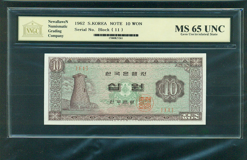한국은행 나 10 원권 1962 년 제 11 판 NNGC MS 65 UNC