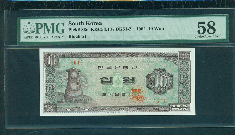 한국은행 나 10 원권 1964년 제 51 판 PMG 58