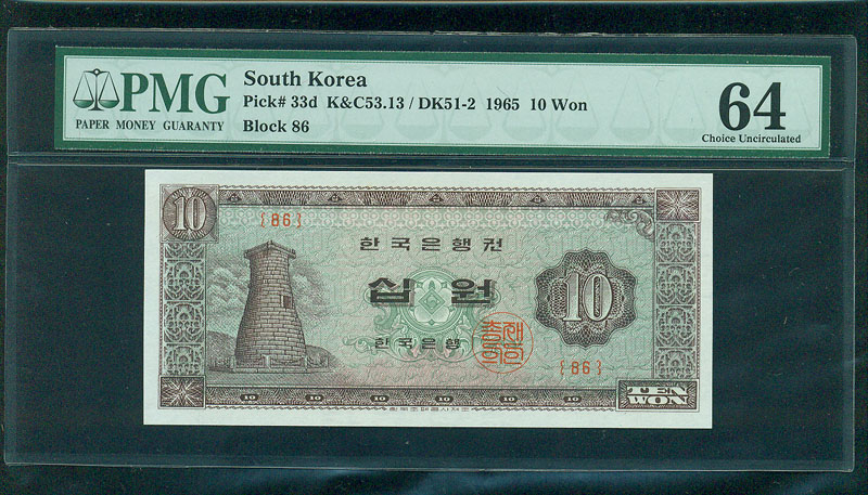 한국은행 나 10 원권 1965 년 제 86 판 PMG 64
