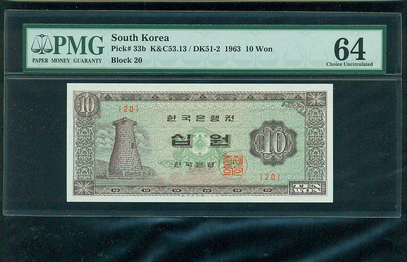 한국은행 나 10 원권 1963 년 제 20 판 PMG 64