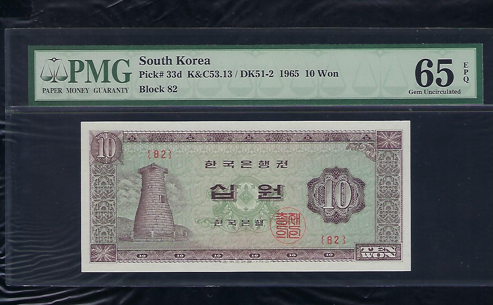 한국은행 나 10 원권 1965 년 제 82 판 PMG 65