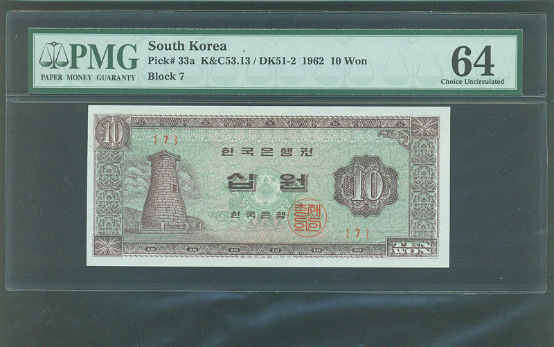 한국은행 나 10 원권 1962년 제 7 판 PMG 64