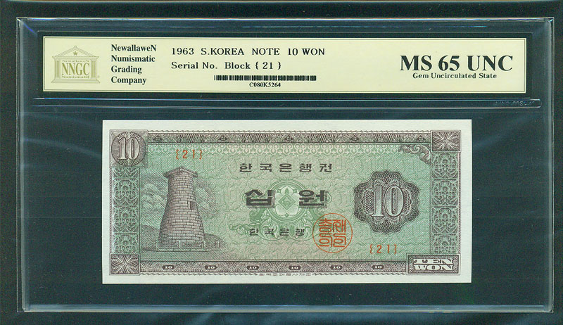 한국은행 나 10 원권 1963 년 제 21 판 NNGC MS 65 UNC