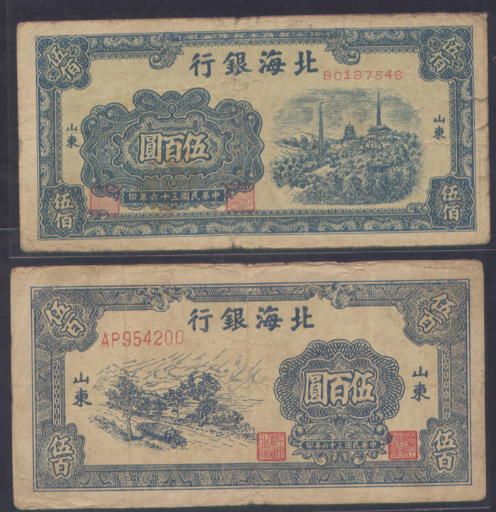 중국 북해은행 500원권 2종 (1947년)